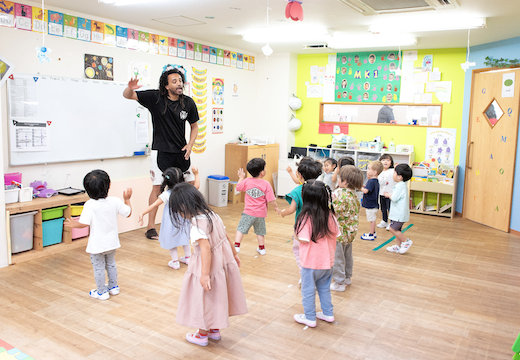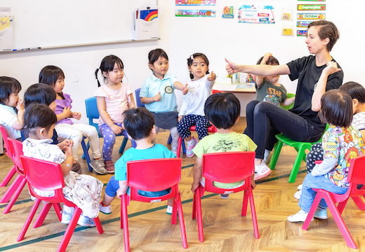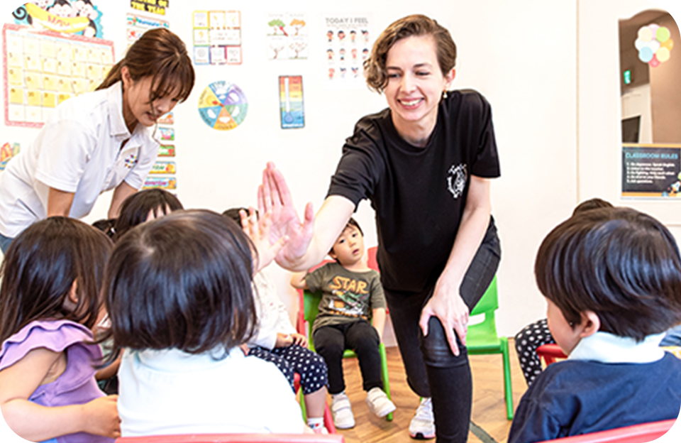 幼児・児童専門のプロネイティブ講師によるオールイングリッシュの環境のもと、身振り手振りを交え「英語で学び、遊び、歌い、踊り、